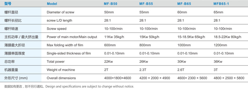 用於(yú)吹製高低壓聚乙烯,產品廣泛用於複合膜,包裝膜,農業(yè)複蓋膜, 紡織品,服裝(zhuāng)袋或(huò)膜等包裝(zhuāng);主電機采用變頻調(diào)速,增加了主機調速的穩 定(dìng)性,並可節電30%,螺杆料筒采用38鉻鉬鋁,經氮化處理,牽引機架采 用升降式